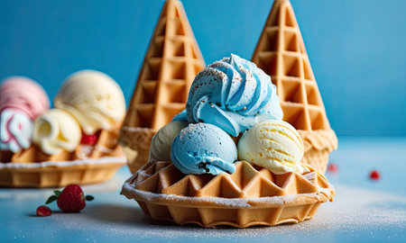 Ice cream in waffle cup. Delicious multicolored cold dessert. Generative AI