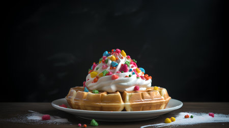 Belgian waffles with whipped cream and colorful candies on black background