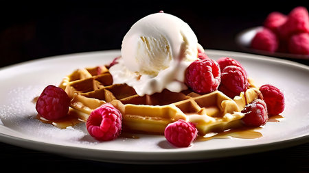 Close up of a delicious ice cream dessert with waffles and raspberries. The ice cream is a creamy vanilla, the waffles are crispy and the raspberries are juicy and sweet.
