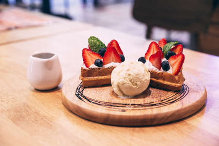 Sweet food waffles with strawberry, and blueberry sauce, ice cream, candy and chips with close up angle