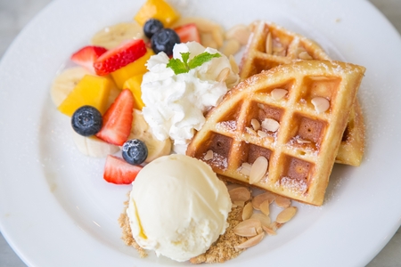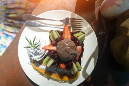 Fresh baked waffle with vanilla ice cream, fruits and chocolate sauce. Belgian waffle topped with ice cream and chocolate sauce served with cappuccino coffee.