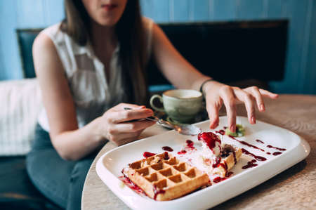 girl eating waffles with jam and ice cream. close-up