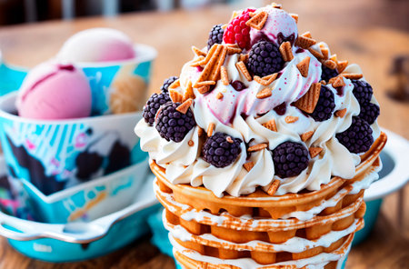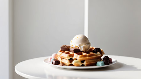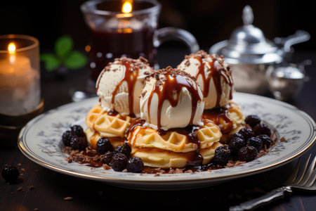 AI Generated. Delicious Waffle with Ice Cream and Chocolate Treats