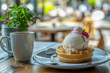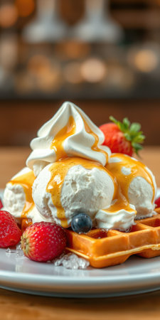 Delicious waffle topped with creamy ice cream, fresh strawberries, and drizzled syrup served in a cozy cafe