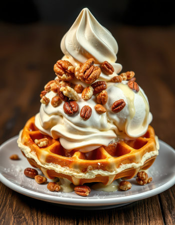 Delightful dessert of soft serve ice cream atop a waffle with crunchy pecans at a cozy eatery
