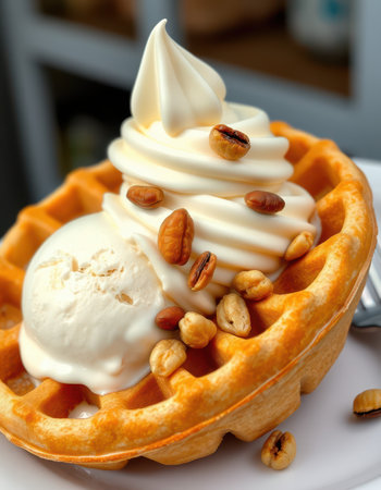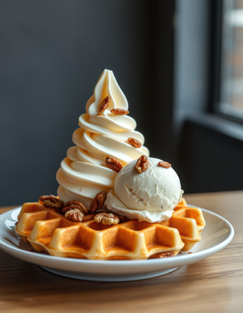 Delicious soft serve ice cream on fluffy waffles topped with pecans in a cozy cafe setting