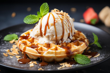 Freshly baked waffle topped with vanilla ice cream, caramel sauce, mint leaves, and almond flakes on a dark plate
