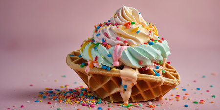 AI Generated. waffle cone close-up with ice cream and colorful sprinkles on a soft pastel background