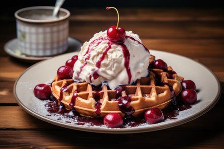 tasty waffle with cherrys and ice cream