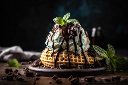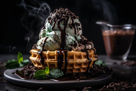 Waffle cone filled with mint chocolate chip ice cream and topped with a sprinkle of chocolate chips and a fresh mint leaf. AI generated