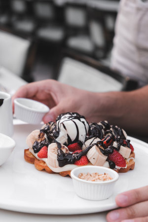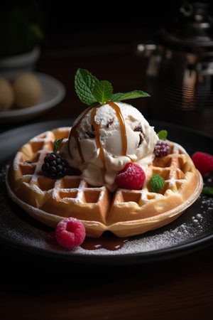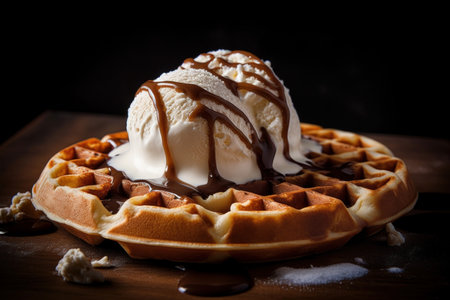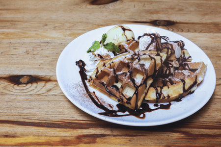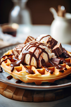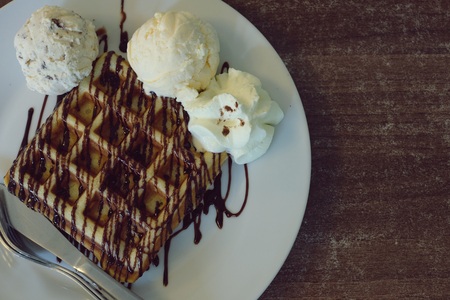waffles with ice cream and chocolate sauce, selective focus, toning