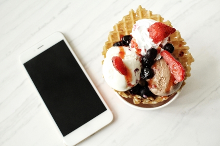 Ice cream with berry and smart phone