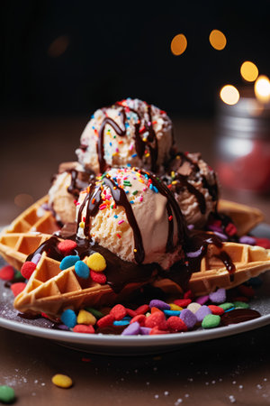 Vanilla ice cream with chocolate sauce and sprinkles, selective focus