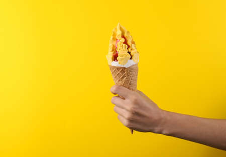 Female hand holds ce cream cone on a yellow background. summer background