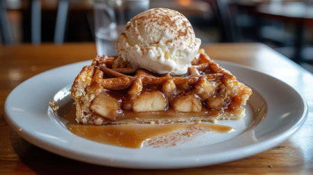 Tempting dessert featuring a warm waffle slice with apple filling, drizzled in caramel, and topped with creamy vanilla ice cream, perfect for any sweet occasion.