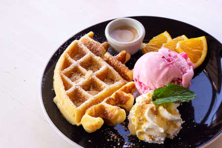 Waffle and vanilla ice cream in white plate on wooden table