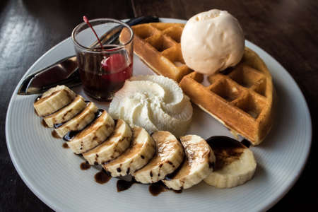 Banana waffle with ice cream and chocolate topping on white plate