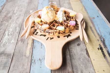 Waffle and ice cream in wooden plate.
