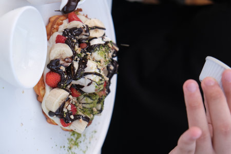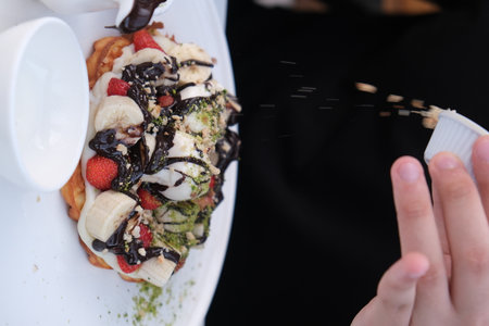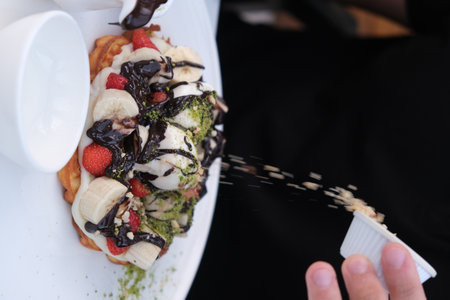 Sprinkle chocolate over the top of the wafer. Delicious sweet treat for children and adults. Baked waffles. Waffles with fruit and chocolate. Dessert