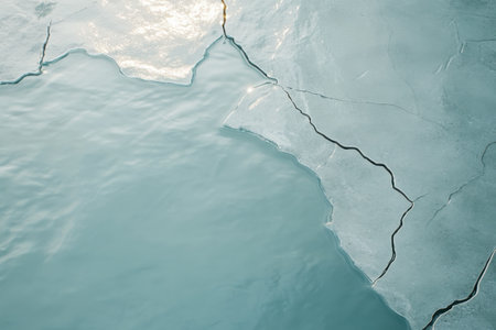 As winter gives way to spring, cracks emerge across the thawing surface of a frozen lake. The shimmering water beneath reflects the changing light and temperatures, marking nature's transition