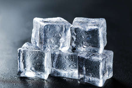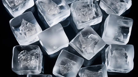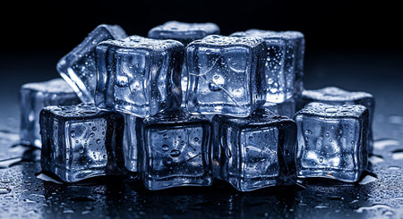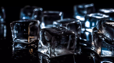 Chilled ice cubes glistening on dark surface offer refreshing coolness for summer drinks and beverage promotions
