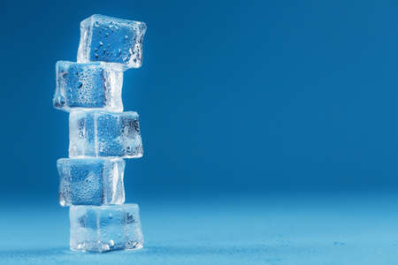 Ice cubes with water drops tower in a row on a blue background. Free space