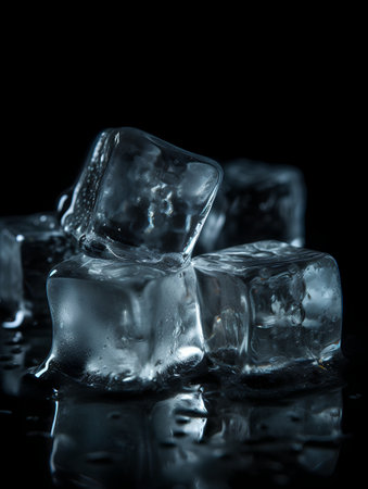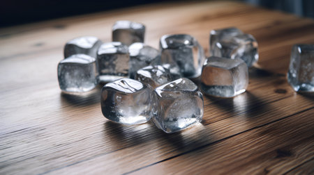 Glistening ice cubes on a reflective table, with water droplets forming around them, giving off a cool, refreshing vibe