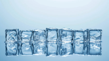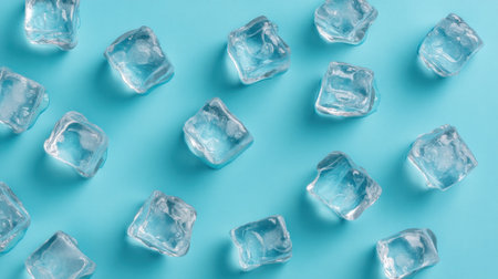 A vibrant arrangement of clear ice cubes on a soft blue background, ideal for conveying freshness and chill. Perfect for summer drink presentations and culinary uses.