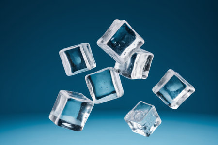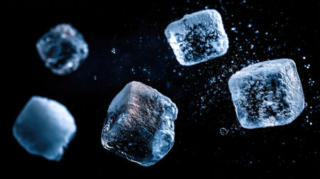 This image showcases several translucent ice cubes suspended against a black backdrop. The cubes display intricate textures and reflections, with droplets of water visible. The composition employs dramatic lighting, emphasizing the geometric shapes and crystalline appearance. This versatile visual could be suitable for various advertising or illustrative purposes.