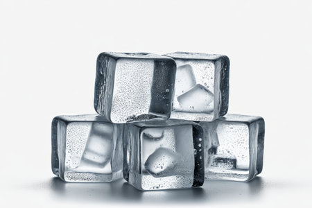 Transparent ice cubes arranged in a trio, isolated on a white backdrop, perfect for summer drink visuals