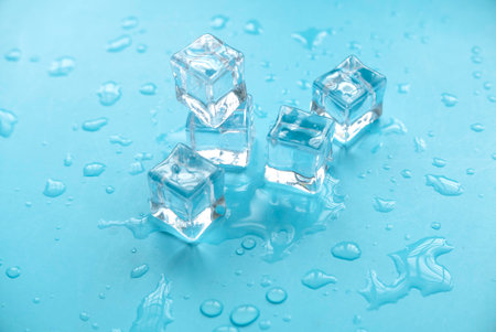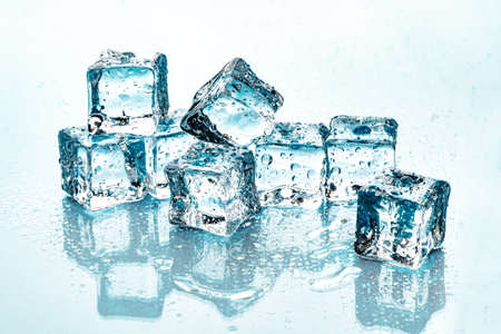 Ice cubes on light blue background.