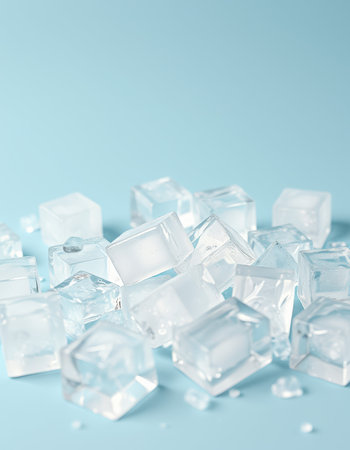 Clear ice cubes scattered on a light blue background create a refreshing summer atmosphere
