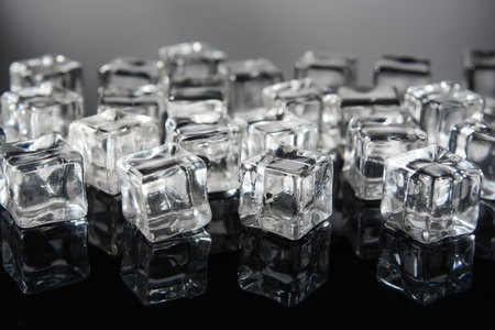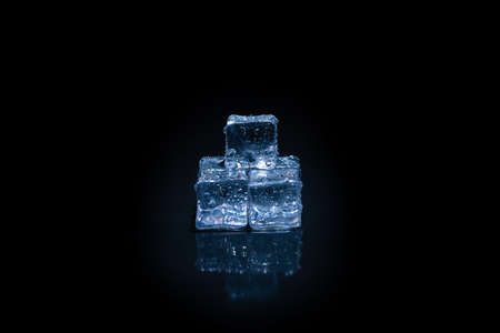 Ice cubes on black reflective background. Shallow depth of field. Toned.