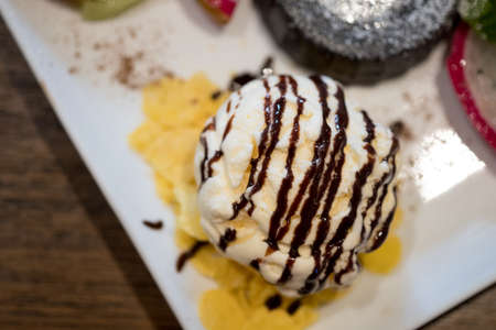 Vanilla ice cream with chocolate sauce topping. Close up