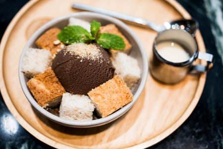 A delectable chocolate ice-cream served with sliced bread and a shot of sweetened condensed milk on a wooden plate is placed on a wooden table at a cafe. Dessert food menu photo, selective focus.