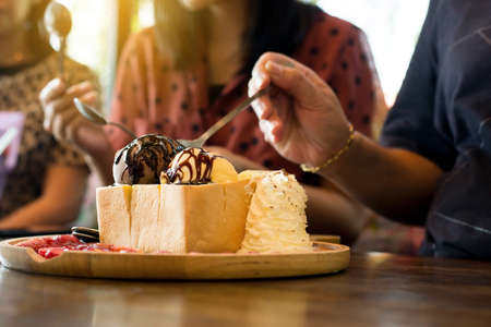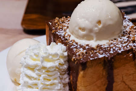 Honey toast chocolate and vanilla icecream Topping with whipped cream,almond slice,strawberry,syrup,Selective focus