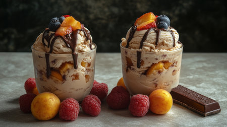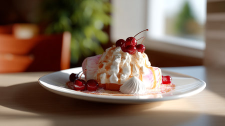 Delicious ice cream sundae topped with whipped cream and fruit