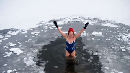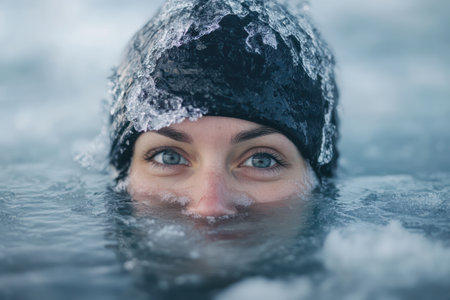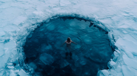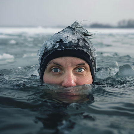 Amusing scene of a woman courageously swimming in an icy lake, capturing cold weather adventure and bold winter fun.