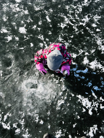 A child on a frozen lake viewing the unique ice texture and winter scenery
