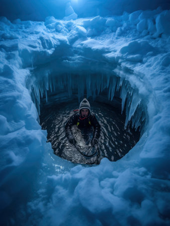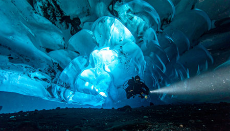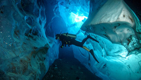 A lone scuba diver navigates the narrow, glowing passages of a surreal underwater ice cave. The brilliant blue light filtering through the ancient glacier creates an otherworldly scene of mystery, adventure, and the raw beauty of Earths most extreme environments.