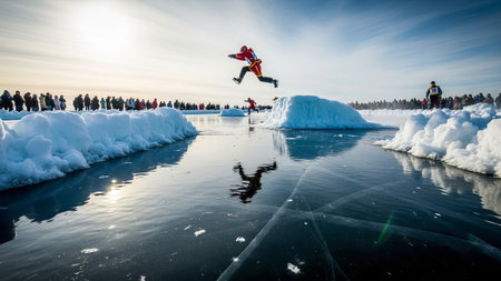 Athlete jumps over ice on frozen lake, winter sport, crowd watching