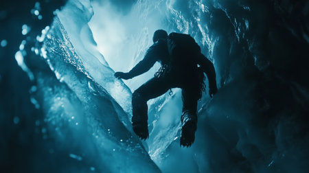 Climber pauses at a towering ice wall, embodying the struggle against obstacles in life, illuminated by striking lighting effects.