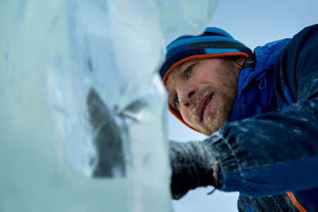 The picture of the ice sculptor holding the tool and equipment for carving the ice block or ice statue in the winter, the ice sculptor require experience in modeling the ice and precision tool. AIG43.