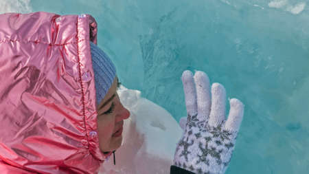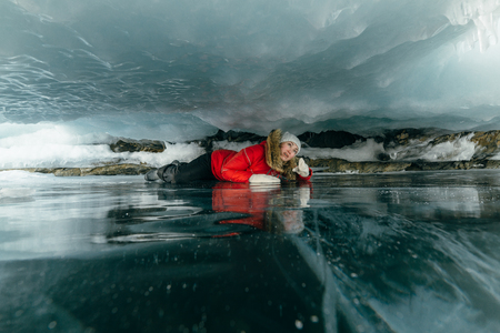 Woman is a tourist and a traveler in the ice. The girl crawls creeps in a small gorge of ice. From above, a sheer dangerous ice layer sinks. From the bottom is a very deep and clean lake with cracks. Location of the lake is Lake Baikal.