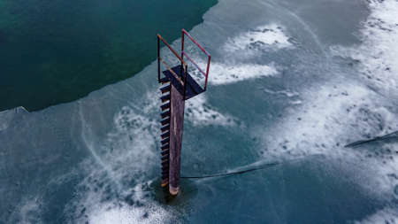 A diver from under the water shines with a flashlight torch an ice hole entry with a for ice scuba diving
