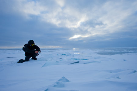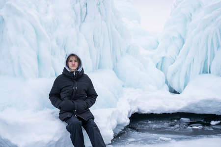 Teenage tourist in a hood sits on the frozen ice of Lake Baikal.