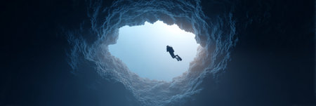 Sunlight filters through a hole in the ceiling of an underwater cave, illuminating a scuba diver exploring the dark depths of the ocean, creating a breathtaking scene of adventure and discovery