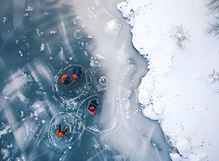 Three people ice fishing on a frozen lake. They wear bright orange jackets. Snow covers the surrounding area. The scene captures winter sports and outdoor activities.