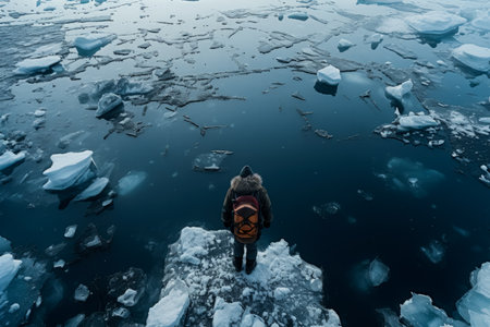 Lone explorer standing on ice floe in glacial lagoon, birds eye view