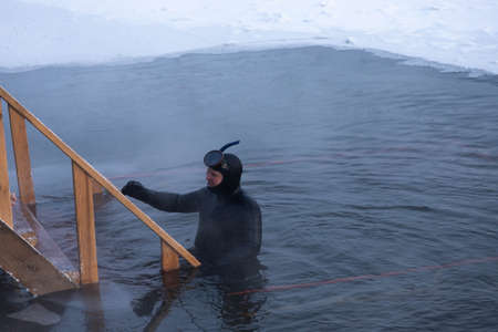 Daring Man immersing in icy water on winter day. Cold river ice snow. Generate AI